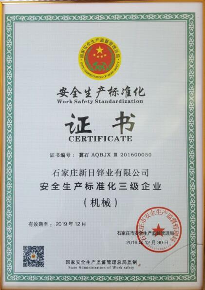 新日鋅業(yè)獲得“安全生產標準化獲得批準證書